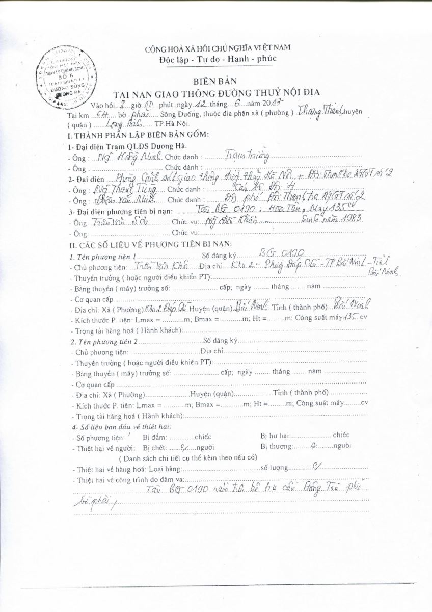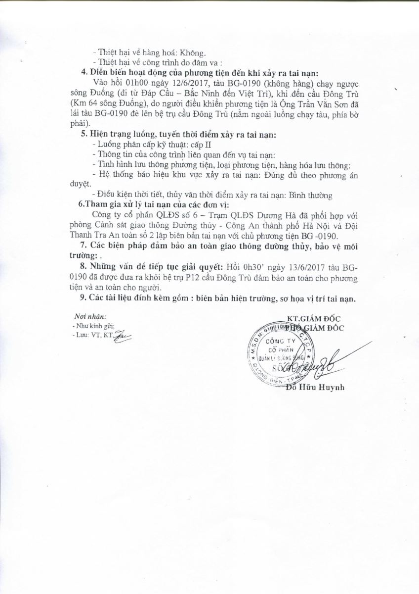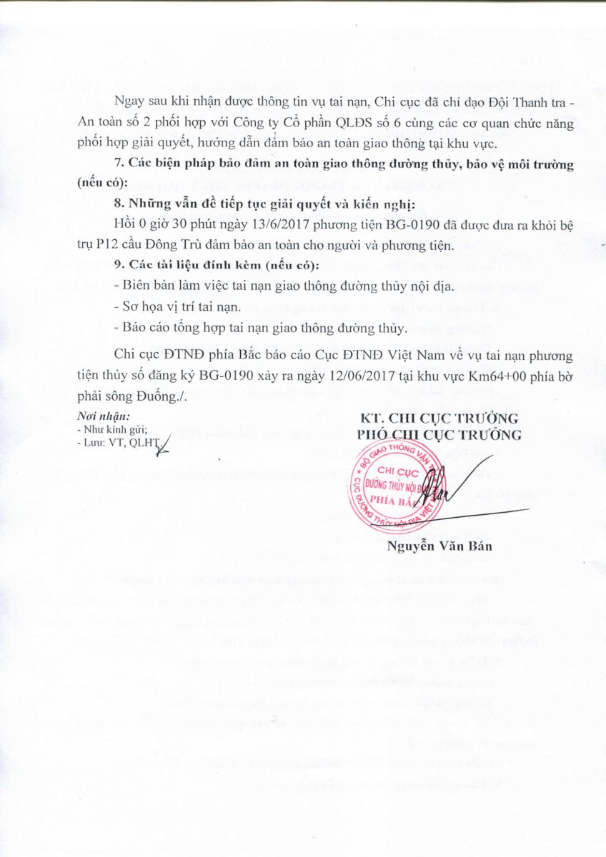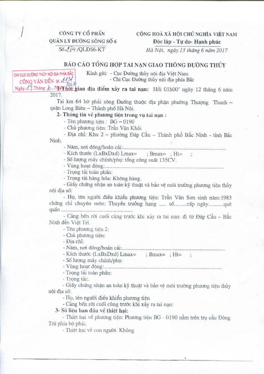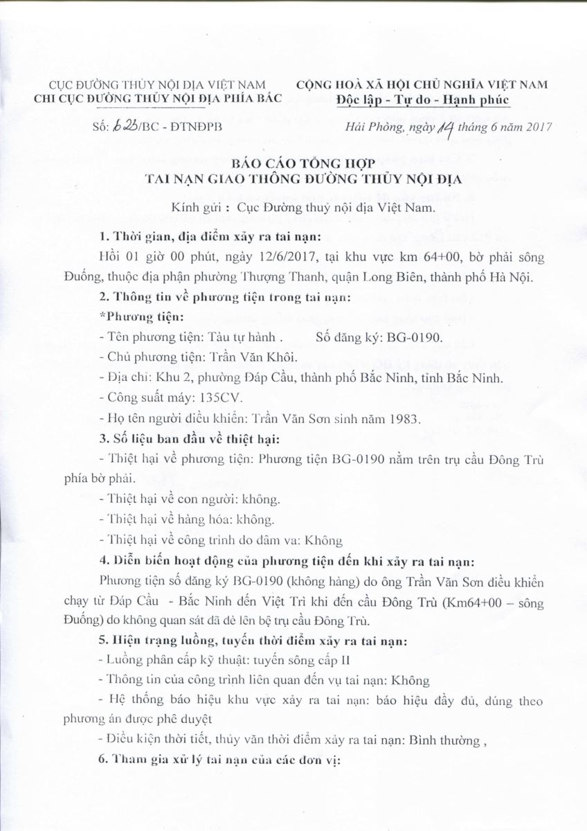 Ngày 13/06/2018 Chi cục ĐTNĐ Phía Bắc có báo cáo số 623/BC-ĐTNĐPB về tai nạn giao thông đường thủy ngày 12/06/2018.
