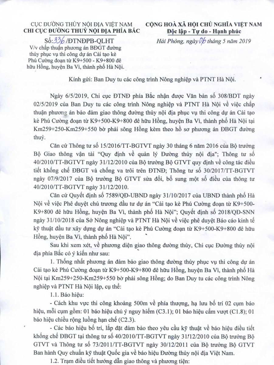 Chấp thuận PA điều tiết bảo đảm GTĐT phục vụ thi công dự án Cải tạo kè Phú Cường đoạn từ K9+500 - K9+800 đê hữu Hồng, huyện Ba Vì, Hà Nội