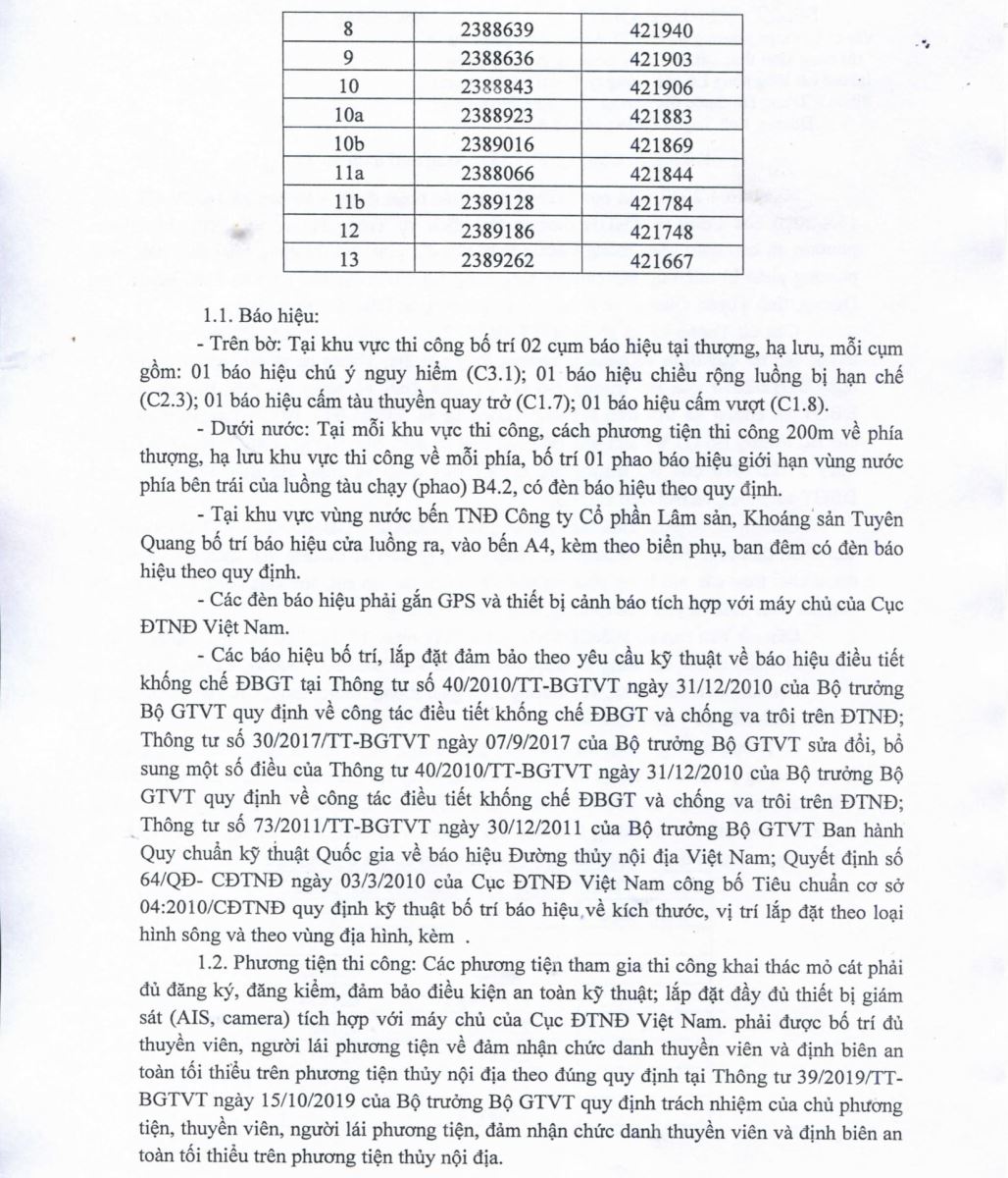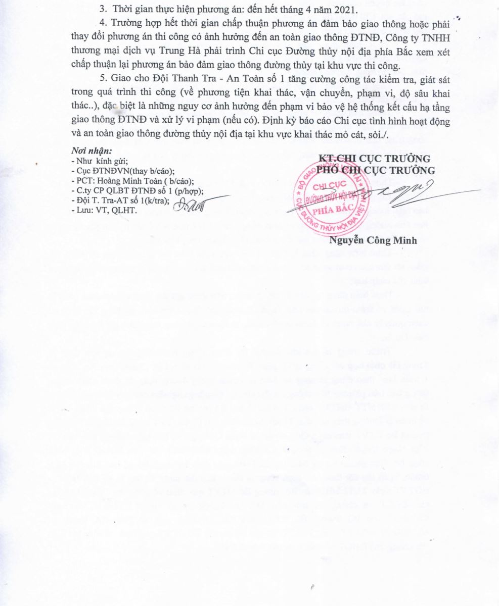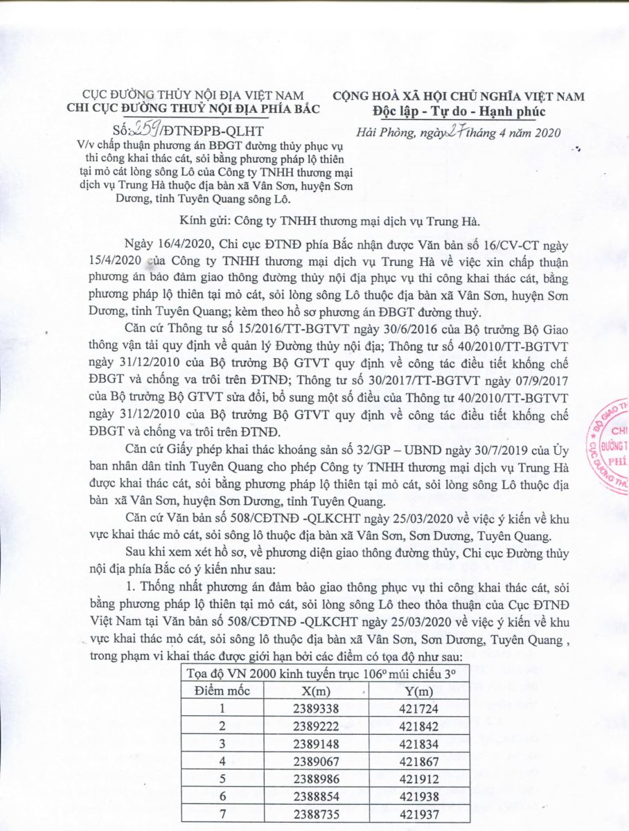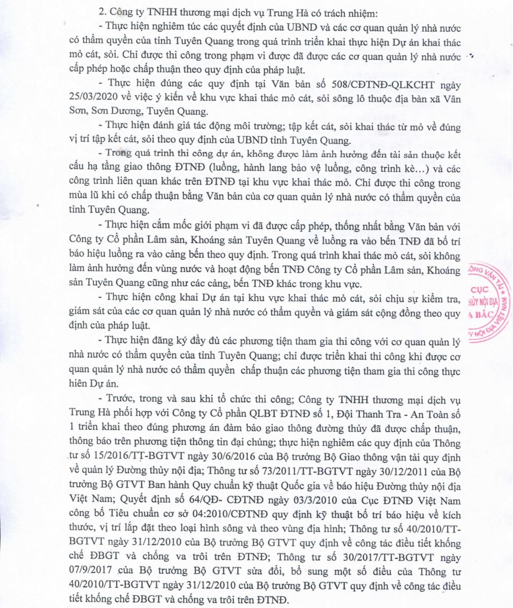Chấp thuận PA điều tiết bảo đảm GTĐT phục vụ thi công khai thác cát, sỏi bằng phương pháp lộ thiên tại mỏ cát lòng sông Lô của Công ty TNHH thương mại dịch vụ Trung Hà thuộc địa bàn xã Vân Sơn, huyện Sơn Dương, tỉnh Tuyên Quang