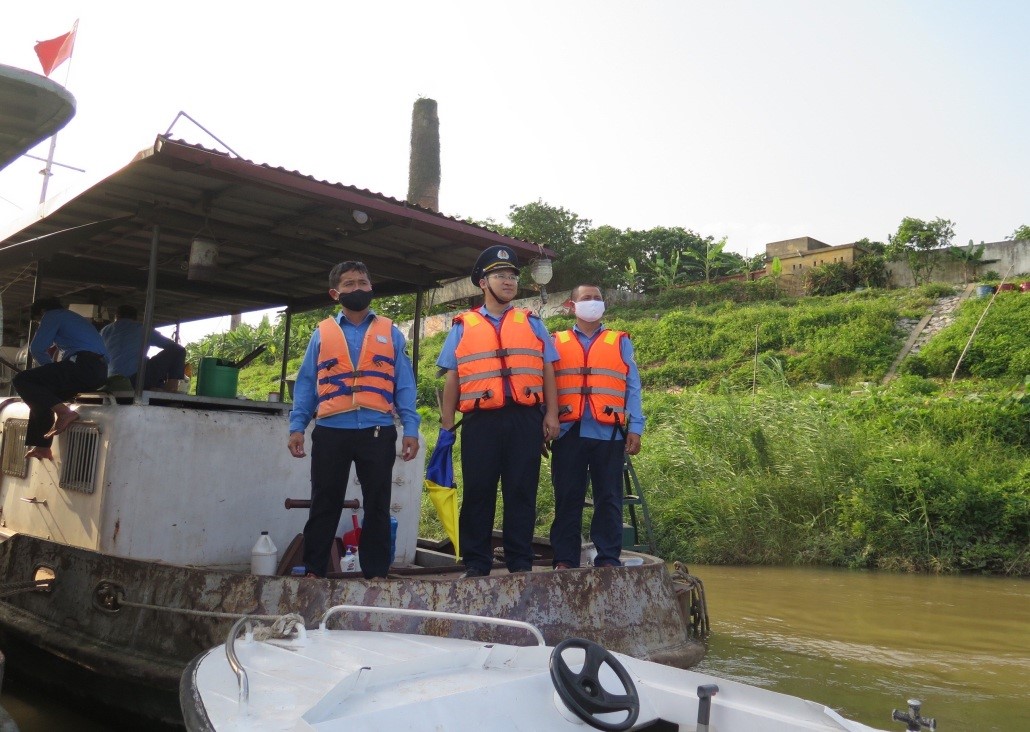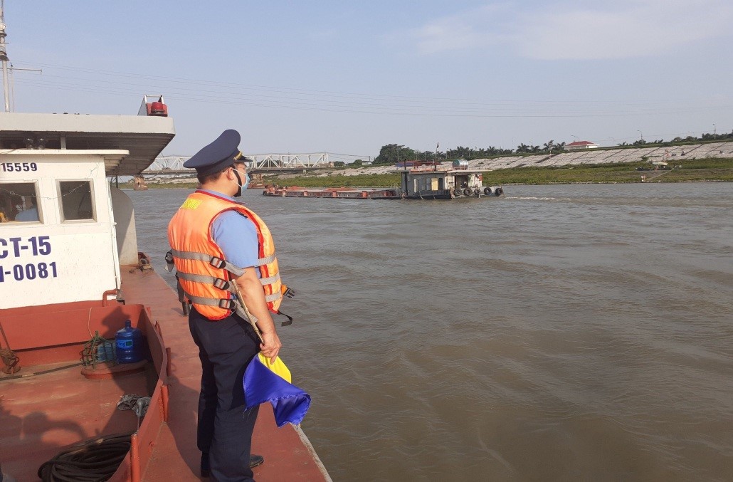 Tại chốt hạ lưu cầu Đuống khu vực km 58+500 bờ phải sông Đuống thuộc phường Giang Biên, quận Long Biên, Thành phố Hà Nội có cán bộ của Đội cảnh sát giao thông đường thủy số 2, PC08- Công an TP Hà Nội và công nhân Công ty Cổ phần quản lý Đường sông số 6 thực hiện phân luồng.