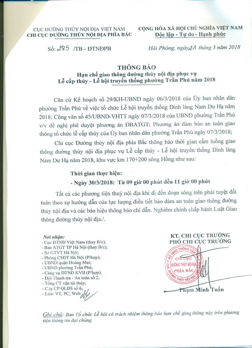 Ngày 21/03/2018 Chi cục ĐTNĐ Phía Bắc ra thông báo Hạn chế giao thông đường thủy nội địa phục vụ Lễ cấp thủy - Lễ hội truyền thống phường Trần Phú năm 2018.