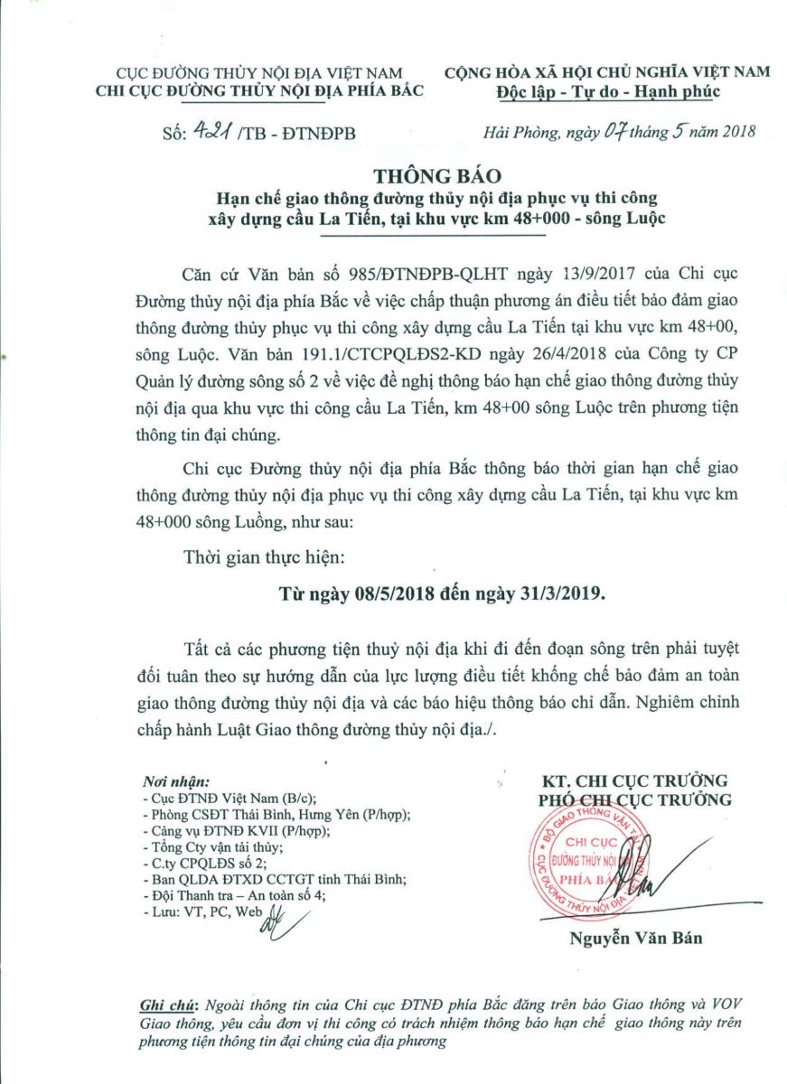 Ngày 07/05/2018 Chi cục ĐTNĐ Phía Bắc ra thông báo Hạn chế giao thông đường thủy nội địa phục vụ thi công xây dựng cầu La Tiến tại km 48+000 - Sông Luộc.