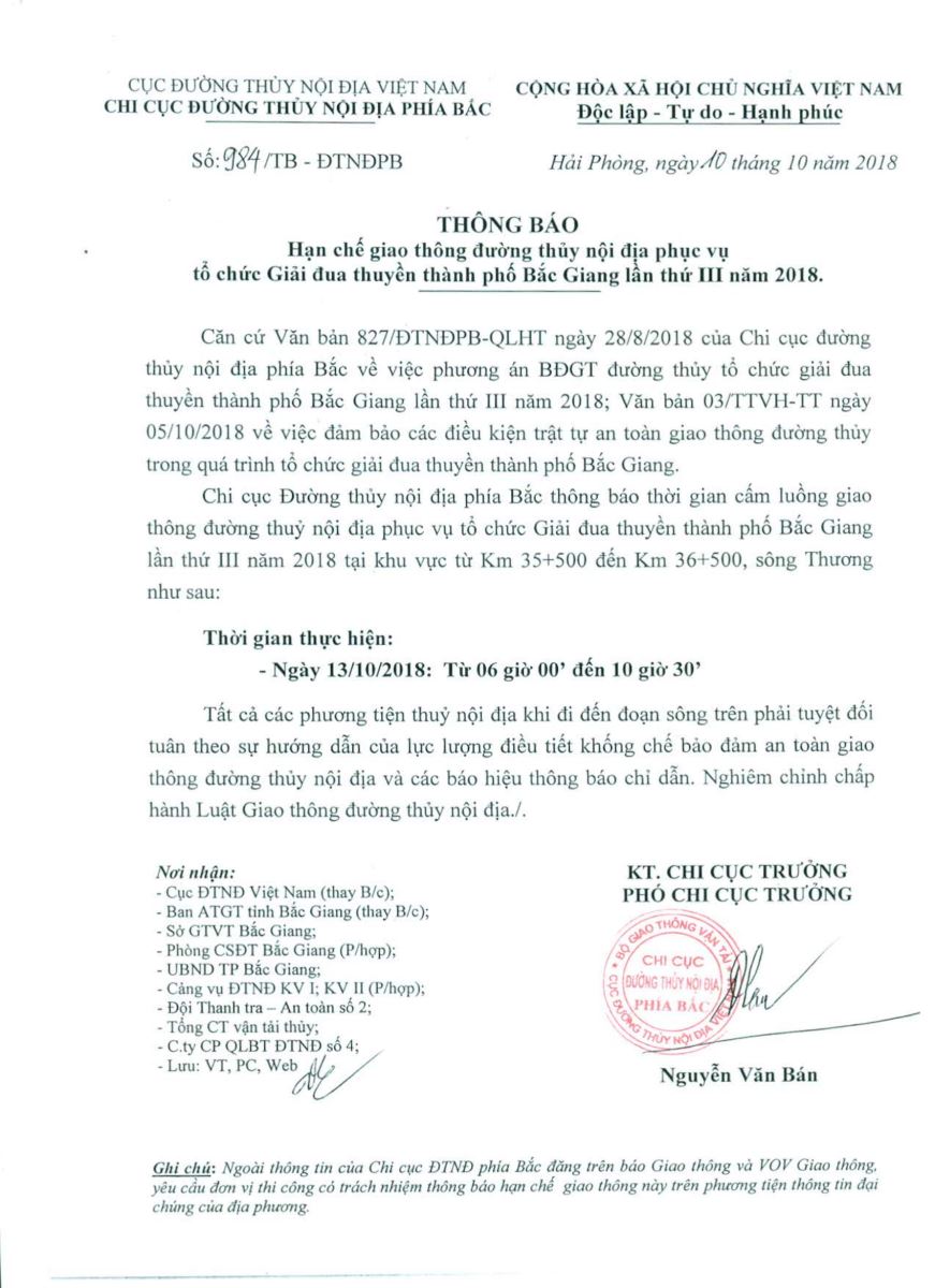 Ngày 10/10/2018 Chi cục ĐTNĐ Phía Bắc có thông báo số 984/TB-ĐTNĐPB về việc hạn chế Giao thông đường thủy nội địa phục vụ tổ chức Giải đua thuyền thành phố Bắc Giang lần thứ III năm 2018