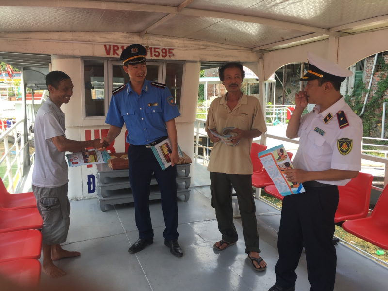 Lực lượng liên ngành phát tài liệu, tuyên truyền pháp luật ATGT đường thủy cho chủ tàu thuyền chở khách du lịch trên lòng hồ thủy điện Hoà Bình.