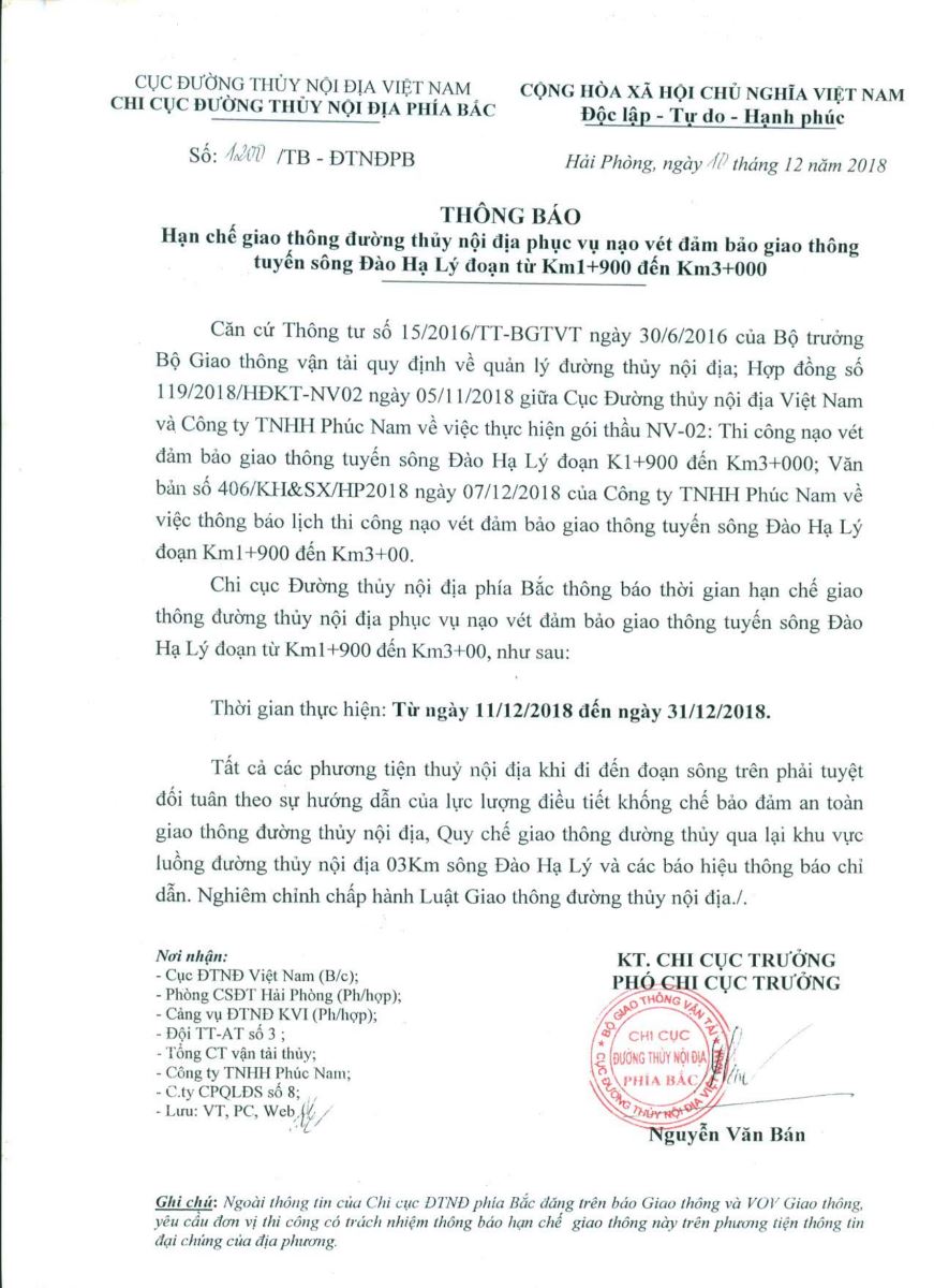 Ngày 10/12/2018 Chi cục Đường thủy nội địa phía Bác ra thông báo số 1200/TB-ĐTNĐPB, thông báo về việc hạn chế giao thông ĐTNĐ khu vực nạo vét tuyến sông Đào Hạ Lý, đoạn từ km 1+900 đến km 3+000. Trong thời gian thi công từ ngày 11/12/2018 đến ngày 31/12/2018 , các phương tiện thủy khi đến đoạn sông trên phải tuyệt đối tuân thủ theo hướng dẫn của lực lượng điều tiết đảm bảo giao thông.
