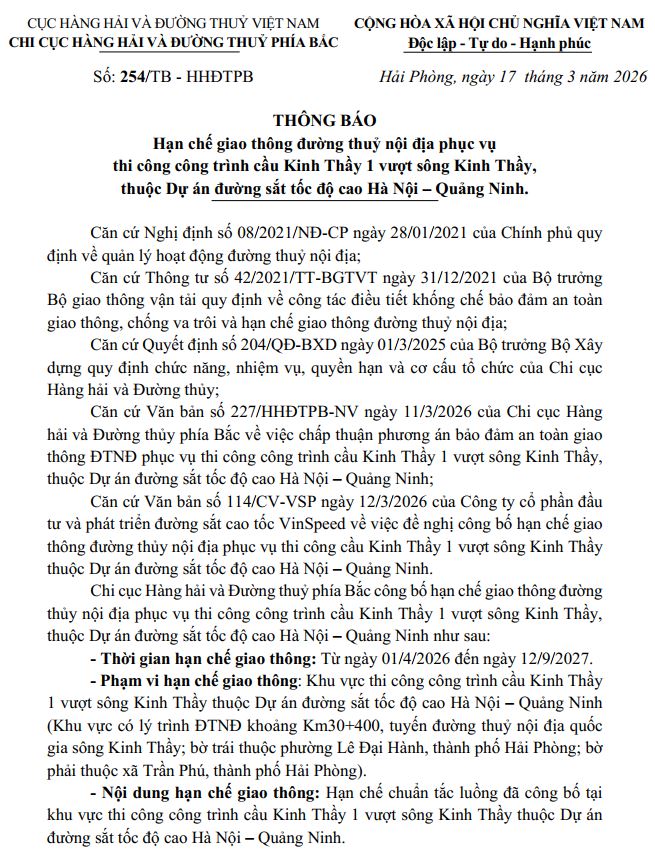 THÔNG BÁO Hạn chế giao thông đường thuỷ nội địa phục vụ thi công công trình cầu Kinh Thầy 1 vượt sông Kinh Thầ ...