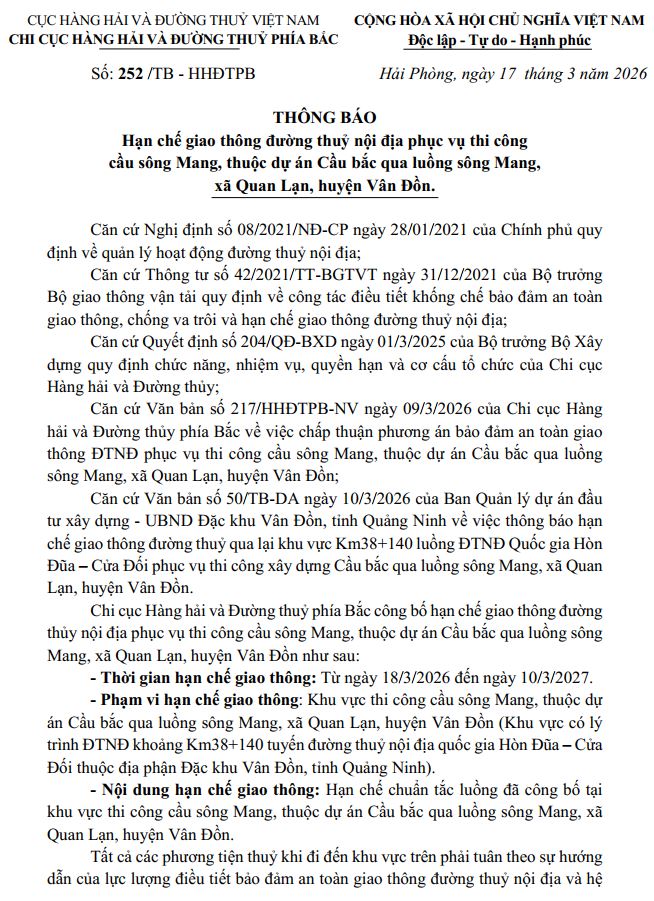 THÔNG BÁO Hạn chế giao thông đường thuỷ nội địa phục vụ thi công cầu sông Mang, thuộc dự án Cầu bắc qua luồng ...