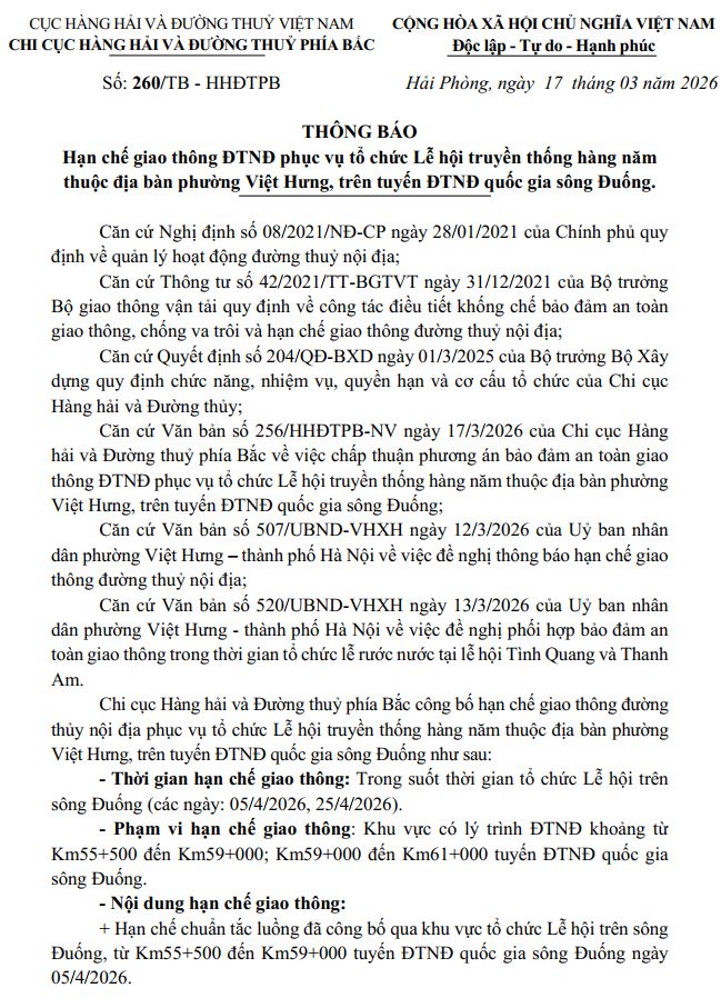 THÔNG BÁO Hạn chế giao thông ĐTNĐ phục vụ tổ chức Lễ hội truyền thống hàng năm thuộc địa bàn phường Việt Hưng, ...