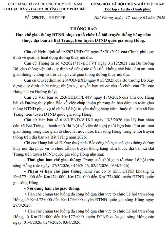 THÔNG BÁO Luồng đường thủy nội địa thường xuyên Tháng 01 năm 2026 (khu vực miền Bắc, từ Quảng Ninh đến Ninh Bì ...