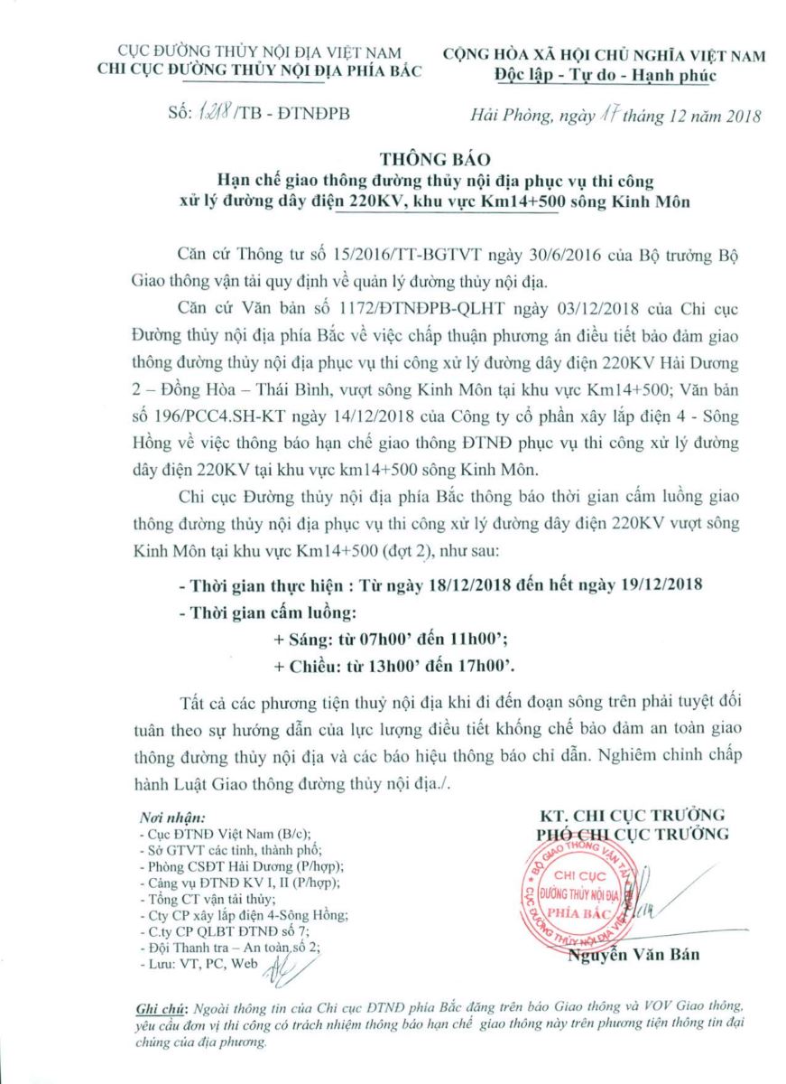 Ngày 17/12/2018 Chi cục Đường thủy nội địa phía Bác ra thông báo số 1218/TB-ĐTNĐPB, thông báo về việc hạn chế giao thông ĐTNĐ khu vực km 14+500 sông Kinh Môn để thi công xử lý đường dây điện 220KV . Trong thời gian thi công từ ngày 18/12/2018 đến ngày 19/12/2018 , các phương tiện thủy khi đến đoạn sông trên phải tuyệt đối tuân thủ theo hướng dẫn của lực lượng điều tiết đảm bảo giao thông.