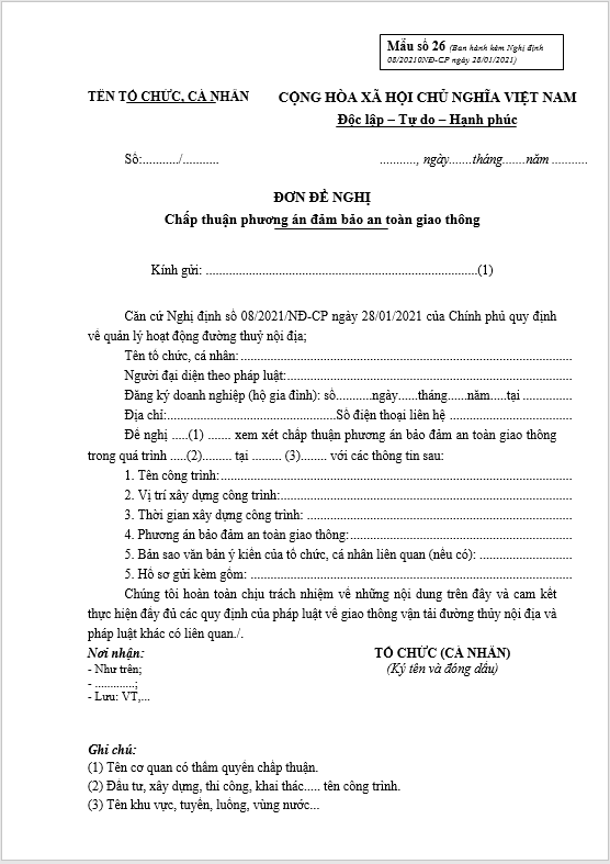 - Đơn đề nghị chấp thuận phương án bảo đảm an toàn giao thông (theo Mẫu số 26 quy định tại Phụ lục kèm Nghị định 08/2021/NĐ-CP ngày 28/01/2021 của Chính phủ)