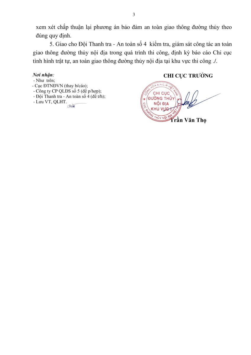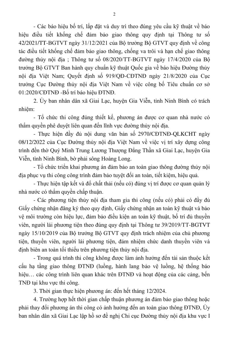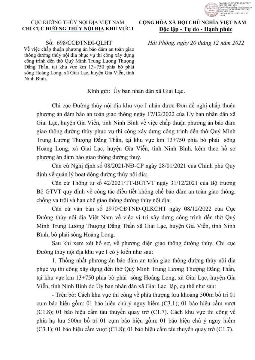 Về việc chấp thuận phương án bảo đảm an toàn giao thông đường thủy nội địa phục vụ thi công xây dựng công trình đền thờ Quý Minh Trung Lương Thượng Đẳng Thần, tại khu vực km 13+750 phía bờ phải sông Hoàng Long, xã Giai Lạc, huyện Gia Viễn, tình Ninh Bình.