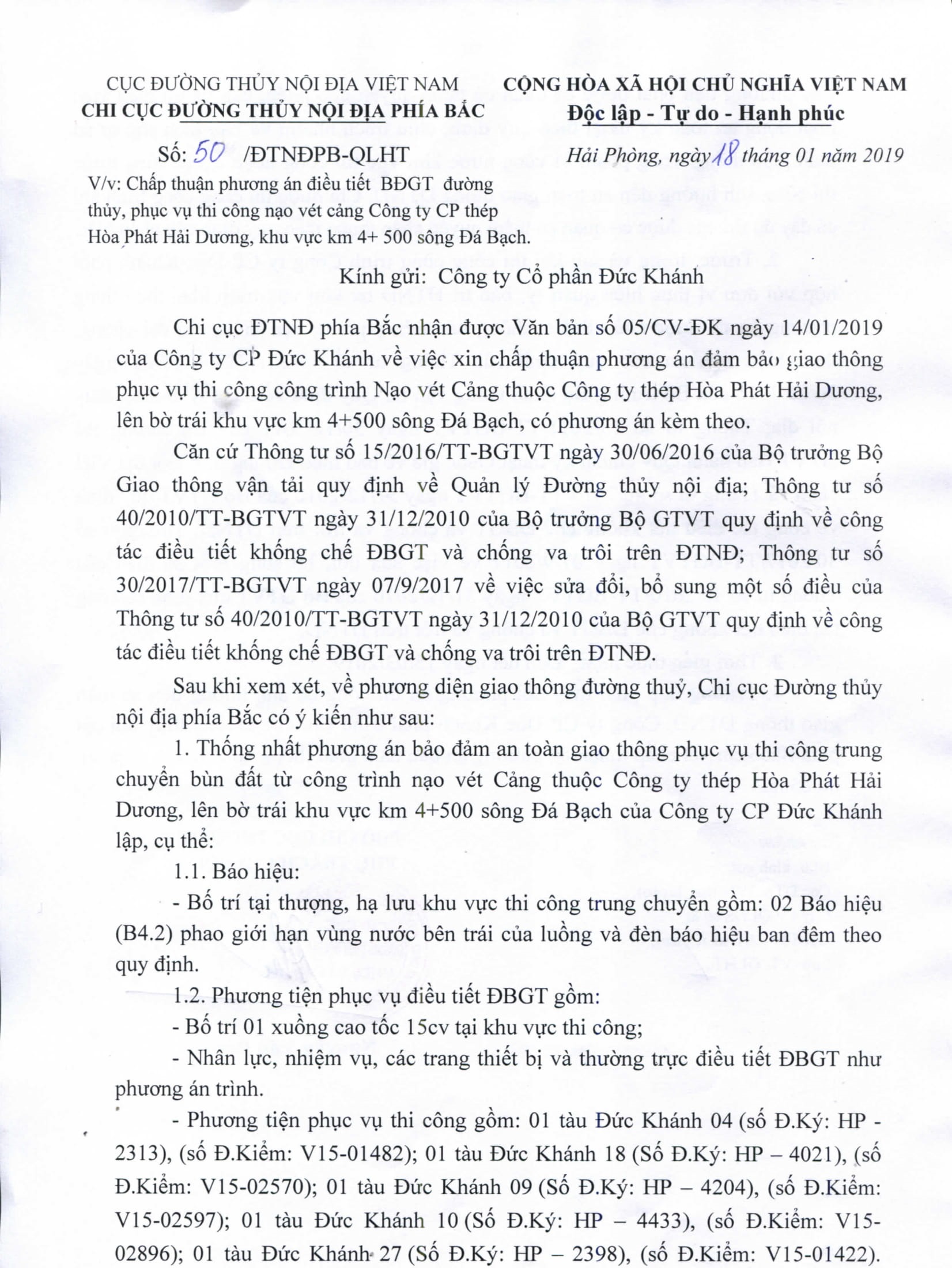 Chấp thuận PA điều tiết bảo đảm giao thông đường thủy khu vực km 4 +500 sông Đá Bạch