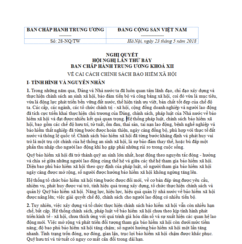 NGHỊ QUYẾT HỘI NGHỊ LẦN THỨ BẢY BAN CHẤP HÀNH TRUNG ƯƠNG KHOÁ XII VỀ CẢI CÁCH CHÍNH SÁCH BẢO HIỂM XÃ HỘI